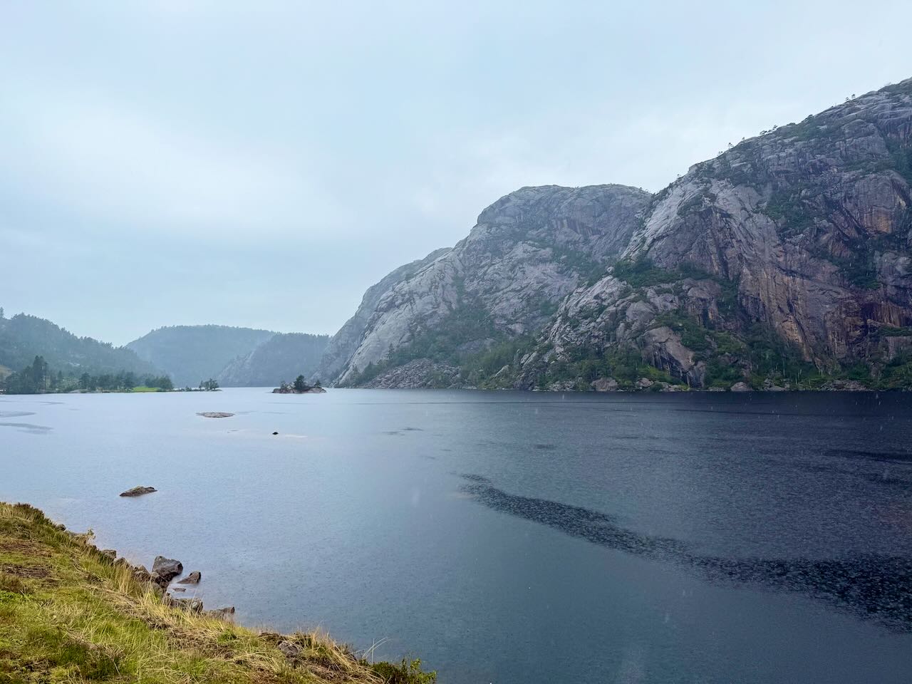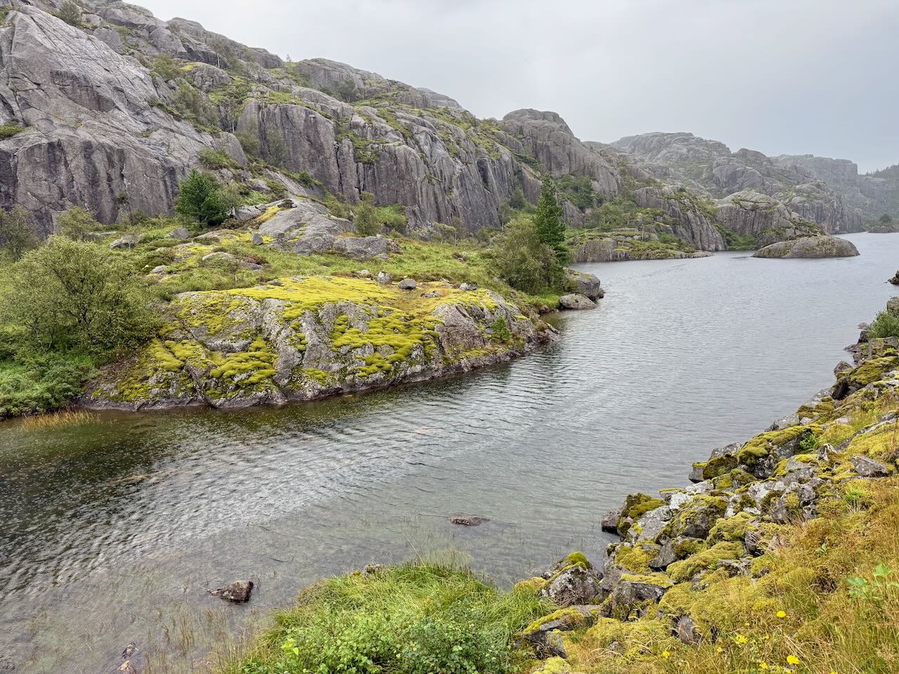 Also wir frühstücken auch und das auch draußen. Bisher war das Wetter sehr gnädig, heute begann der Tag bedeckt. Ab Mittag ist Regen angesagt. Wir fahren heute nach Flekkefjord, ein kleines Städtchen am Fjord und von da auch noch an den Jøssingfjord. Die Straße dorthin ist teilweise nur 3-4 m breit, das hält die Norweger aber nicht ab, dort auch mit großen 40t LKW mit Hänger hinzufahren. Hätte wohl doch den Wohnwagen mitnehmen sollen ;-). Leider ist das Wetter dann doch sehr regnerisch geworden, deshalb gibt es nicht so viele Bilder: